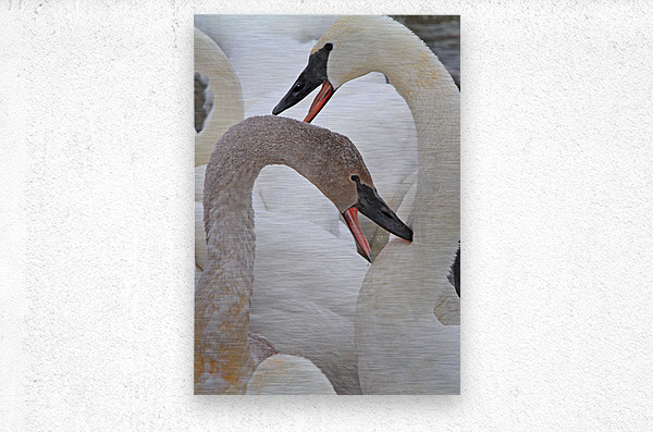 A cygnet trumpeter swan pecks at its parent which responds in kind, #0785