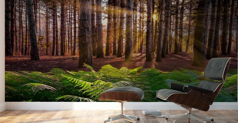 Scenic stand of pines in the woods of Minnesota at daybreak with foreground ferns (AI rendered), #2364b.