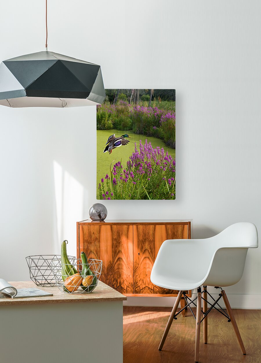 Get this artwork "Mallard in flower pond" in a framed print.
