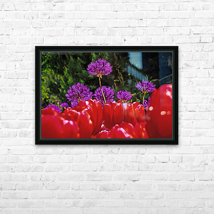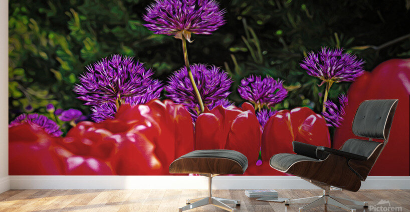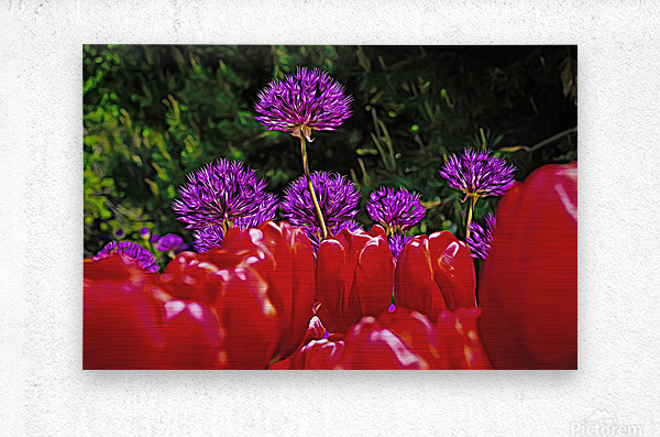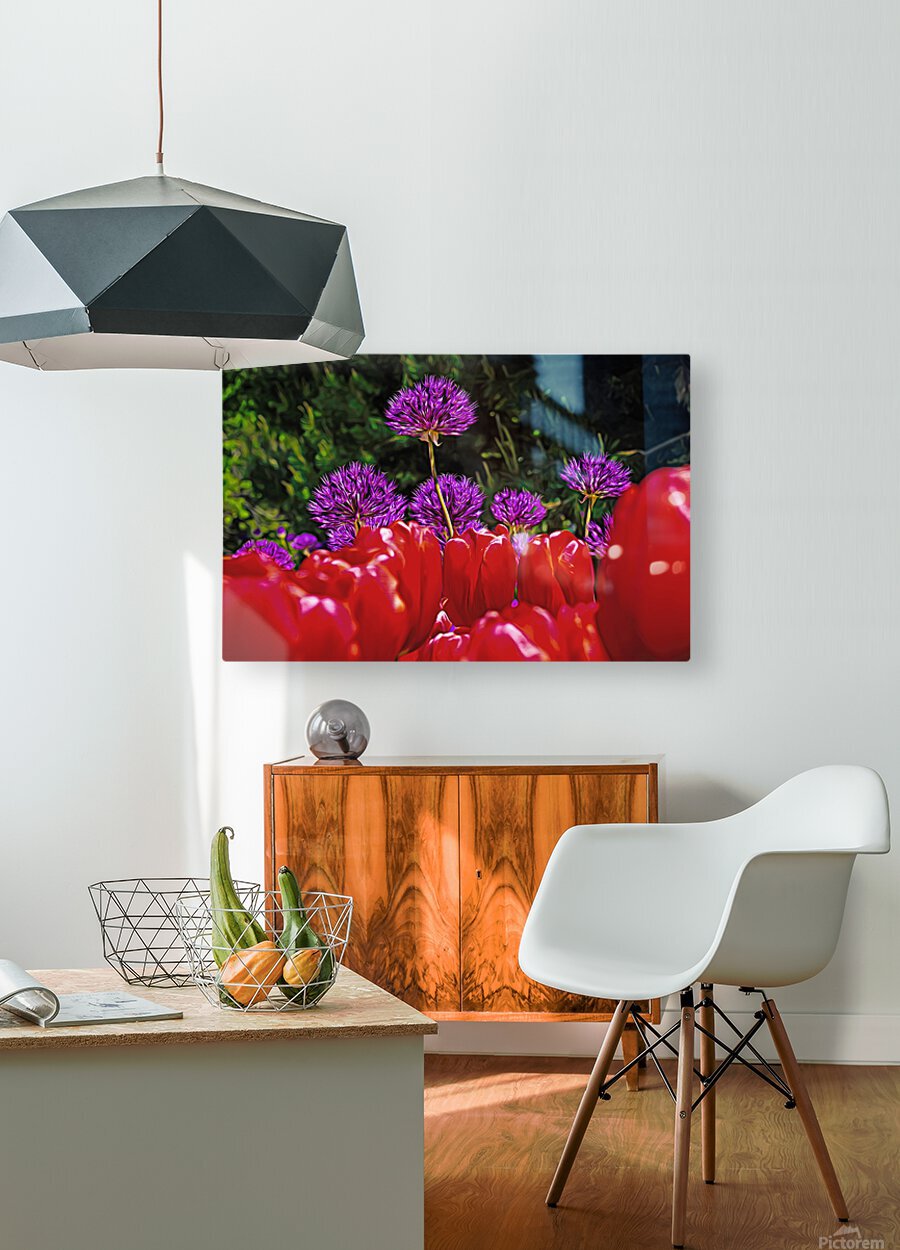 Purple onion flower with red tulips, #2128