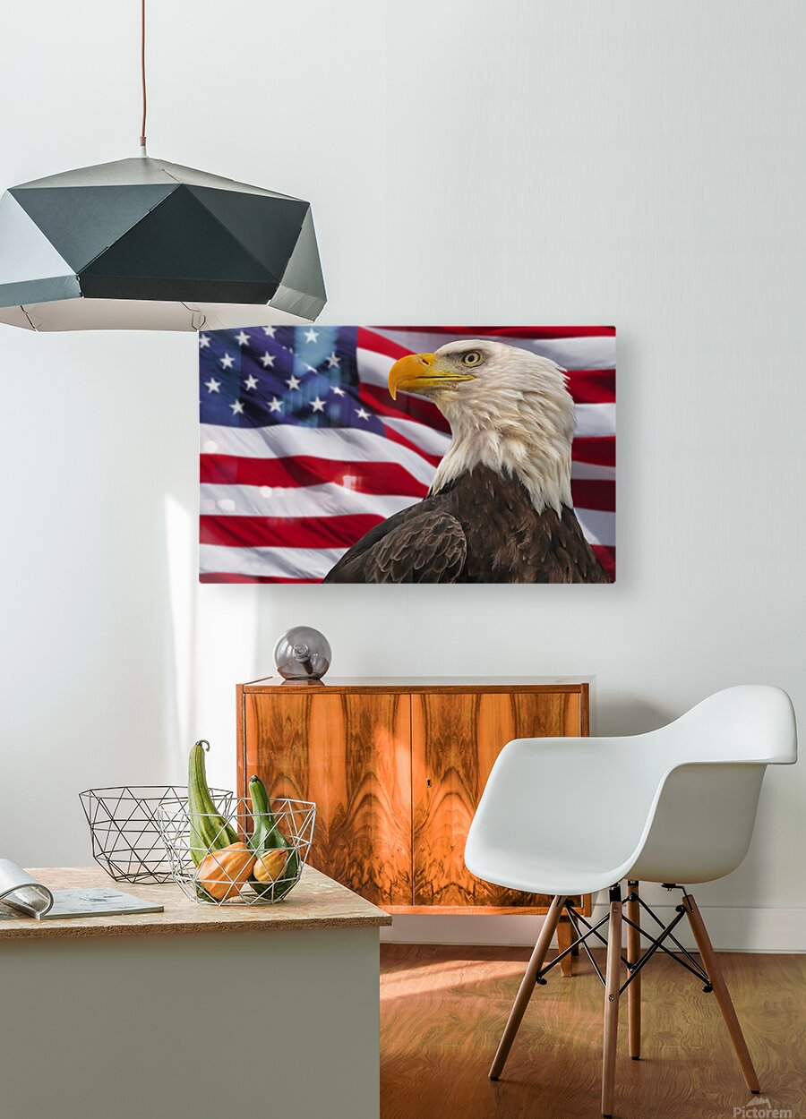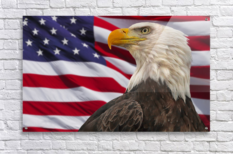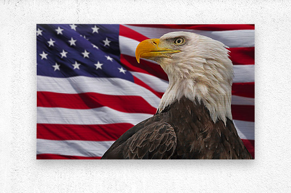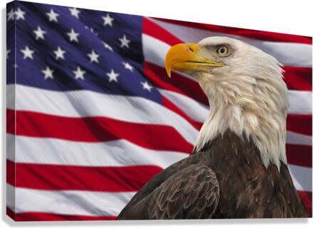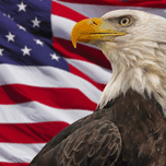 Standing before 'Old Glory' the bald eagle is America's symbol of strength, beauty and freedom, #0631