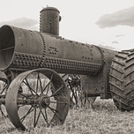 Turn of the century (circa 1910) farm steam engine, that replaced the ox and horse in the field ... un-restored and rusted with a riveted boiler, an...[+]
