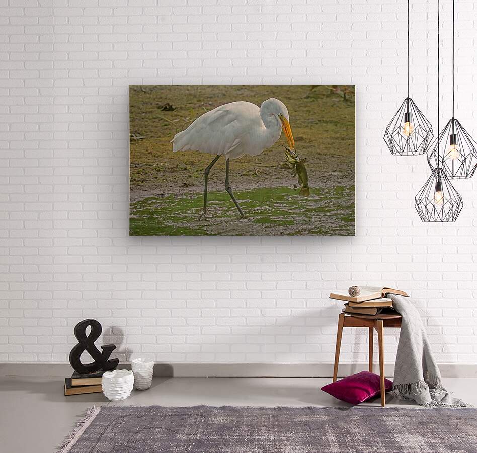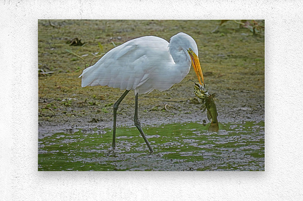 Get this artwork "Catfish dinner for egret" in a framed print.
